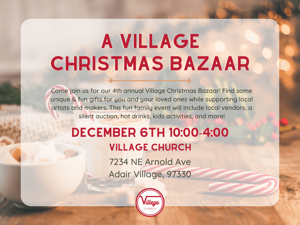 This year marks our 4th annual Village Christmas Bazaar! Find some unique & fun gifts for you and your loved ones while supporting local artists and makers. This fun family event will include local vendors, a silent auction, hot drinks, kids activities, and more!